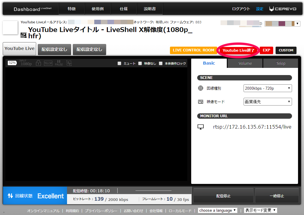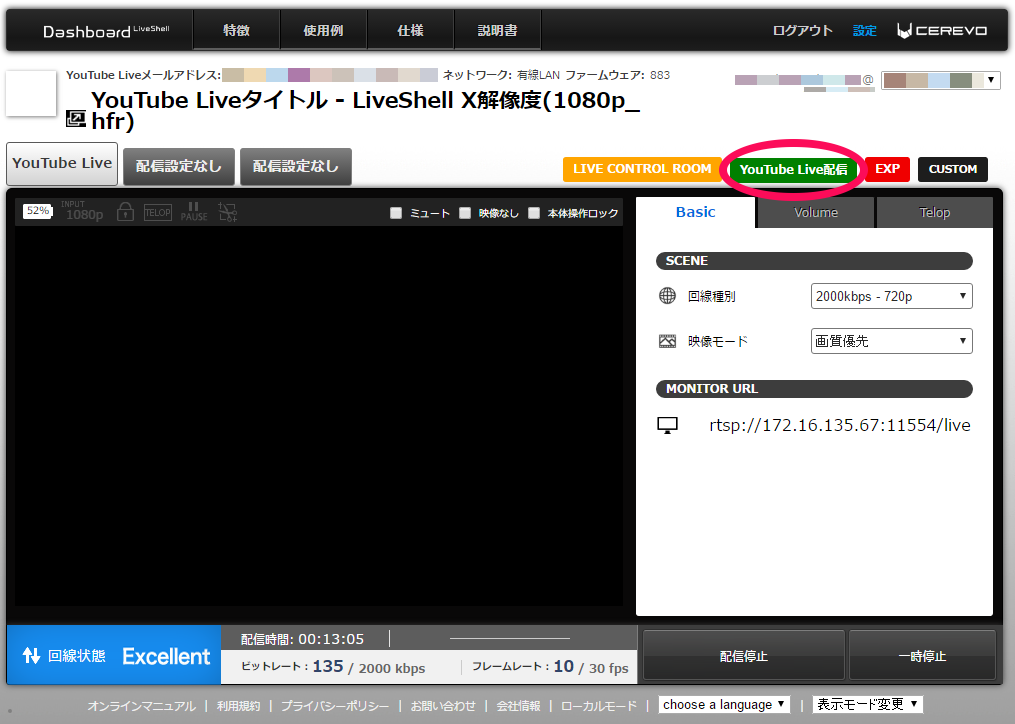 ※画面は配信を開始するまでDashboardには表示されません。プレビュー映像を確認する場合は「LIVE CONTROL ROOM]をクリックし、YouTube Liveの管理画面からご覧ください